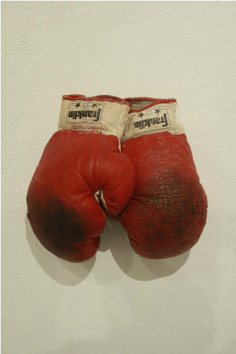 EK: I’m really inspired by the work of David Hammons. He’s incredible. He’s a Black installation artist, activist and performance artist. He has these pieces that are whole-body prints. In some of his earliest works, he covered certain parts of his body in oil and printed basketballs and stuff like that. That’s a body of work that is really inspiring to me, especially when I was first working with hair. So I have had these boxing gloves for a while. As a woman of color, I often feel like I’m defending myself and having to find ways to feel empowered within myself. I’m working with the ideas of protection and femininity. I am also thinking about the exertion of anger. I’m highlighting the beauty and light in anger and aggression- -not just as a woman, but specifically as a woman of color. I am thinking about that a lot. There are lots of associations with boxing and African-Americans. So I have these gloves, and they are making me think about a lot of things.