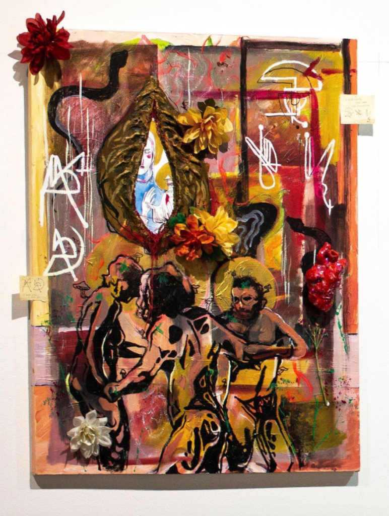 There was another work that you sent me from last semester’s midterm show that also had religious elements inside, like inside the vulva was a religious figure. And then the halo around the three people dancing in a circle. Can you talk a little bit more about that piece?