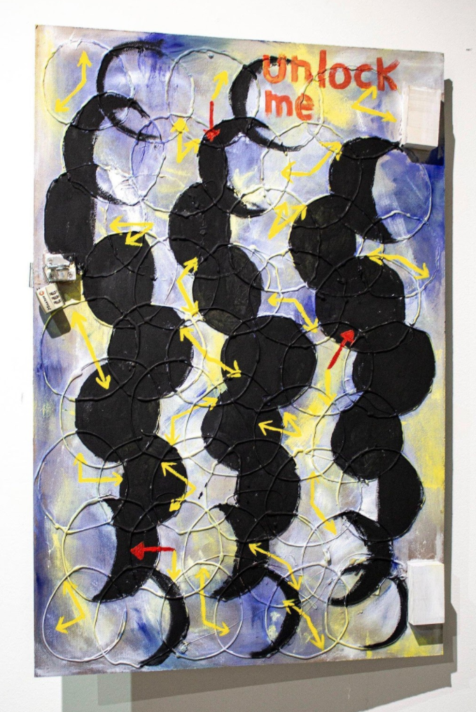 I try to reward careful and close looking. I think especially last semester I included codes in all the paintings that I made. One of them has a bunch of poems and then there were highlighted words in the poems that you could put together to make a new poem. And one of them was a painting that closed and then had a lock and if you unlocked it, you could open it up to find another painting on the inside. I think I want to continue with that where I want people to be able to engage, like, really engage with the work. I’m putting effort and time and thought and emotion into this. And I want people to have the option to come in and get real close and think about it and uncover the codes. There will be more information if they want it. And if they don’t want it, they can also just look at it and it’s nice to just look at. I want it to be a choice that if people want to engage in a deeper conversation they can. There is a choice to be able to do that.